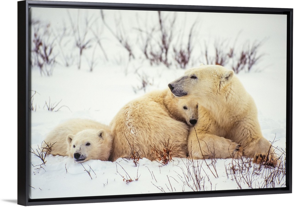 <p>Polar bear cubs (Ursus maritimus) snuggle up to their mother in the snow along Hudson Bay Manitoba, Canada</p>