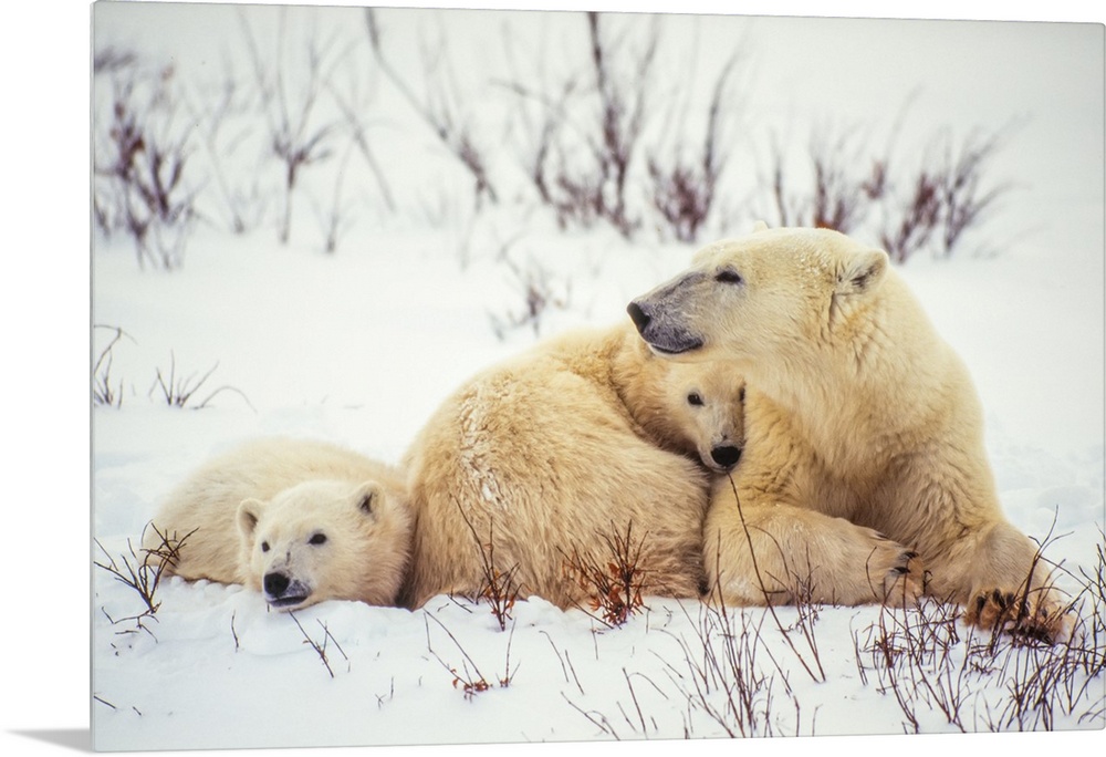 <p>Polar bear cubs (Ursus maritimus) snuggle up to their mother in the snow along Hudson Bay Manitoba, Canada</p>