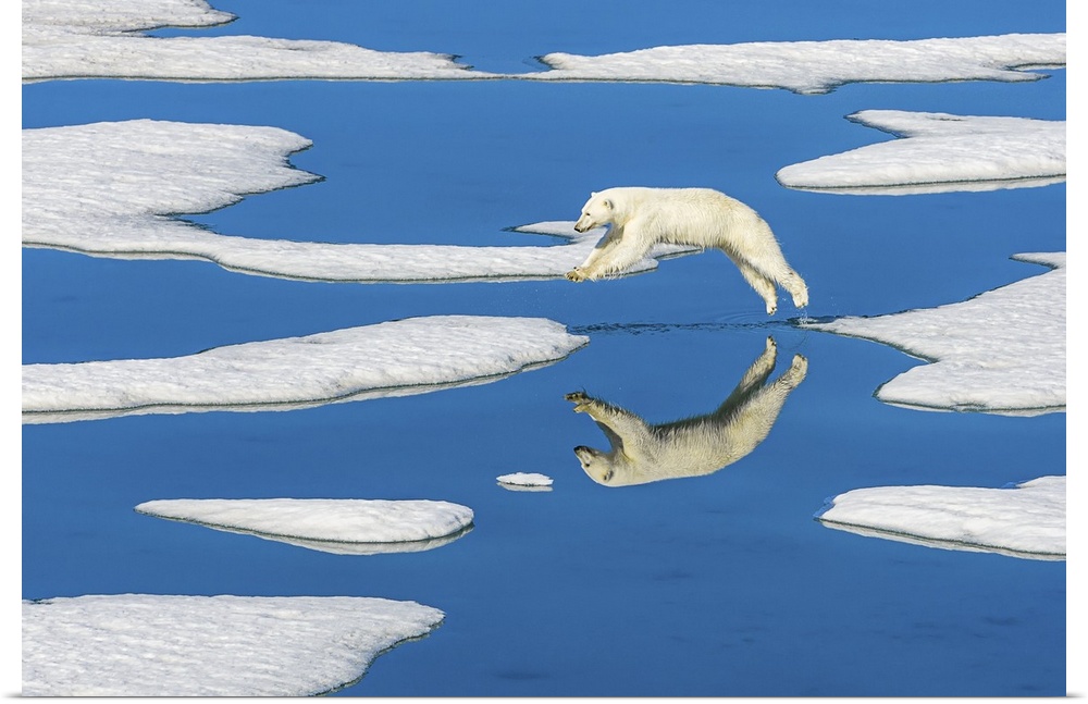 <p>Polar bear (Ursus maritimus) jumps across melting pack ice with blue water pools Svalbard, Norway</p>