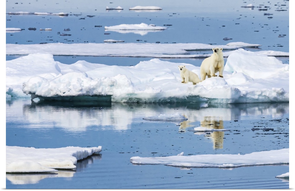 <p>Polar bear mother and cub (Ursus maritimus) on iceberg, Hinlopen Strait Svalbard, Norway</p>