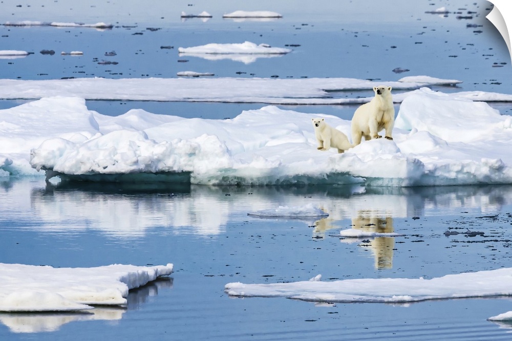 <p>Polar bear mother and cub (Ursus maritimus) on iceberg, Hinlopen Strait Svalbard, Norway</p>