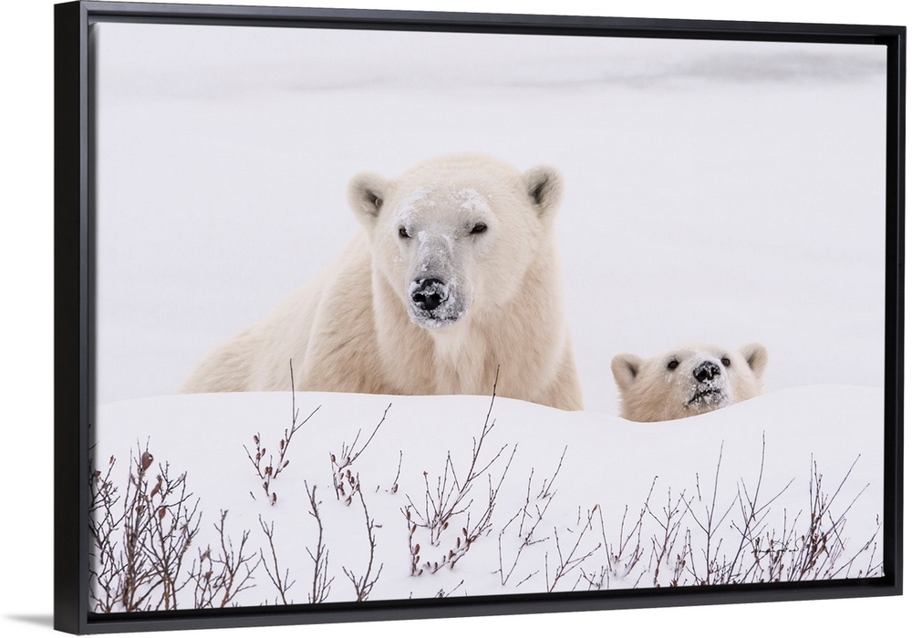<p>Polar Bear (Ursus maritimus) mother and cub near the Hudson Bay Coast, Manitoba, Canada, cautiously eyeing the photographer.</p>