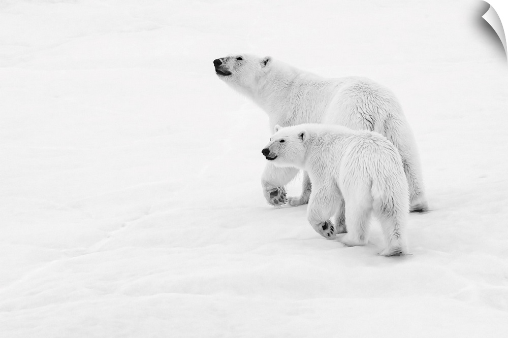 <p>Polar bear (Ursus maritimus) mother and cub walking on pack ice, Black and white image, Northeast Svalbard Nature Preserve Svalbard, Norway</p>