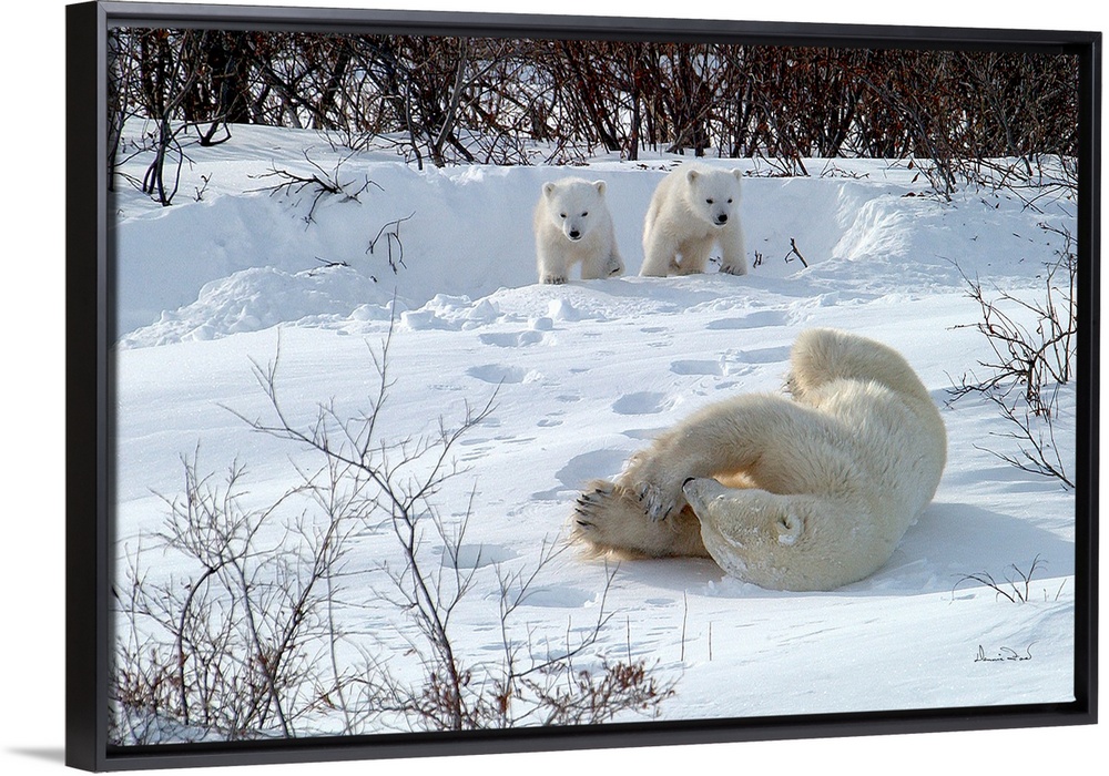 <p>Twin polar bear cubs (COY) watch mother having a long stretch after first emerging from their den in Wapusk National Park, Manitoba, Canada.</p>
