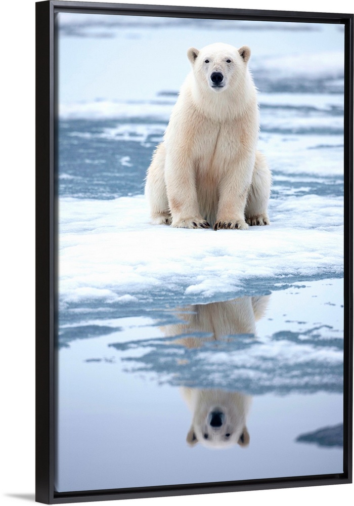 <p>Polar Bear (Ursus maritimus) resting at edge of melting sea ice along Sabinebukta Bay at Irminger Point. | Location: Nordauslandet, Svalbard, Norway.</p>