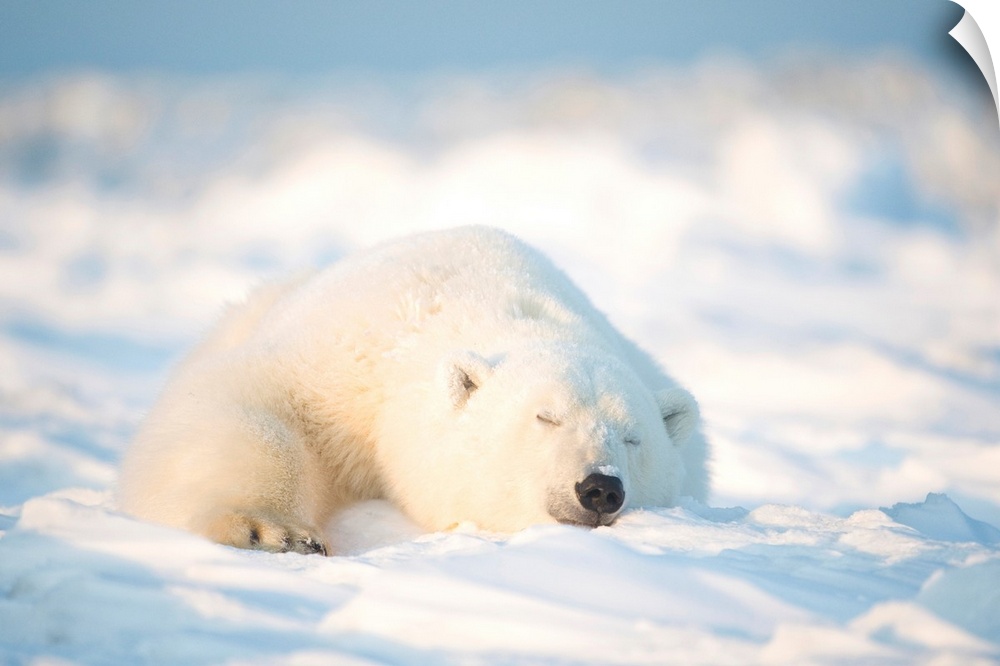 <p>Polar bear (Ursus maritimus), young bear rests on the newly frozen pack ice, Beaufort Sea, off the 1002 area of the Arctic National Wildlife Refuge, North Slope, Alaska.</p>