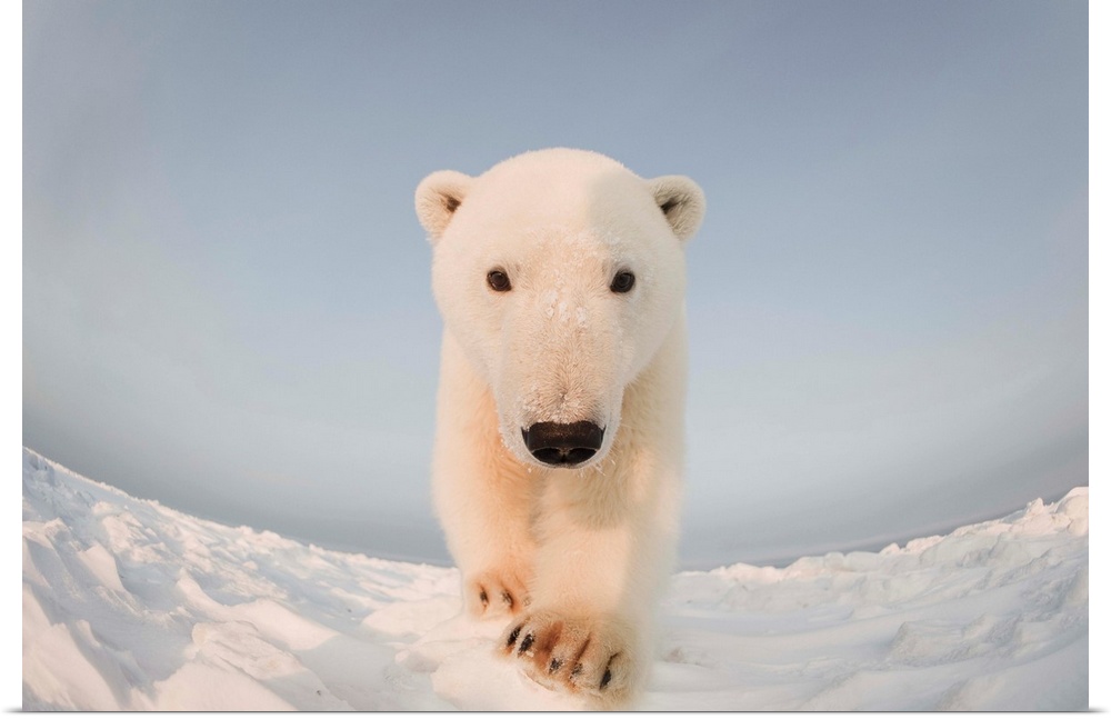 <p>Polar bear (Ursus maritimus), curious young boar on the newly frozen pack ice, Beaufort Sea, off the 1002 area of the Arctic National Wildlife Refuge, North Slope, Alaska.</p>