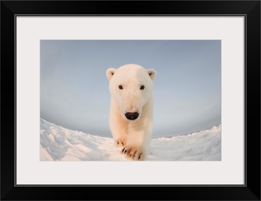 <p>Polar bear (Ursus maritimus), curious young boar on the newly frozen pack ice, Beaufort Sea, off the 1002 area of the Arctic National Wildlife Refuge, North Slope, Alaska.</p>