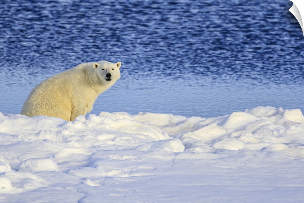 <p>Under the Midnight sun, Polar Bear (Ursus maritimus) on pack ice, Hinlopen Strait Svalbard, Norway</p>