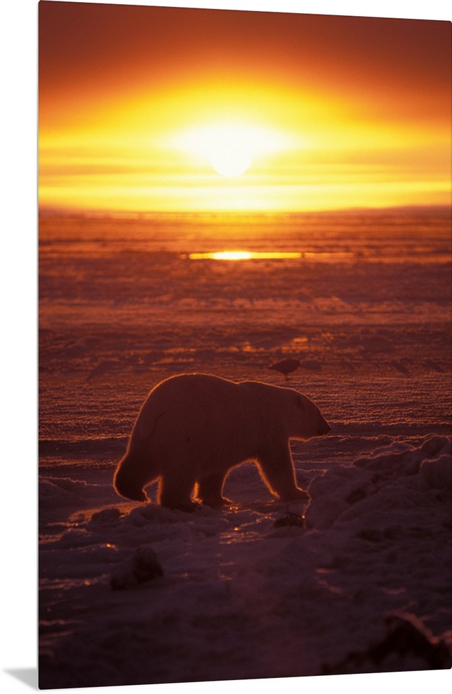 <p>Polar bear (Ursus maritimus) at sunrise on the pack ice of the frozen coastal plain, 1002 area of the Arctic National Wildlife Refuge, Alaska.</p>