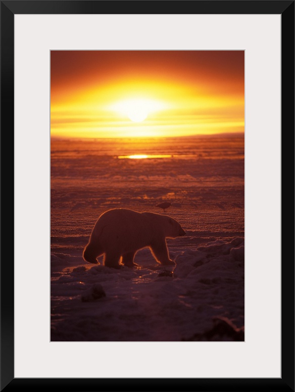 <p>Polar bear (Ursus maritimus) at sunrise on the pack ice of the frozen coastal plain, 1002 area of the Arctic National Wildlife Refuge, Alaska.</p>