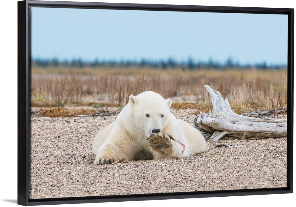 <p>Polar Bear (Ursa maritimus) playing with a goose feather on sub-arctic Hudson Bay , Nsnuk Lodge, MB, Canada</p>
