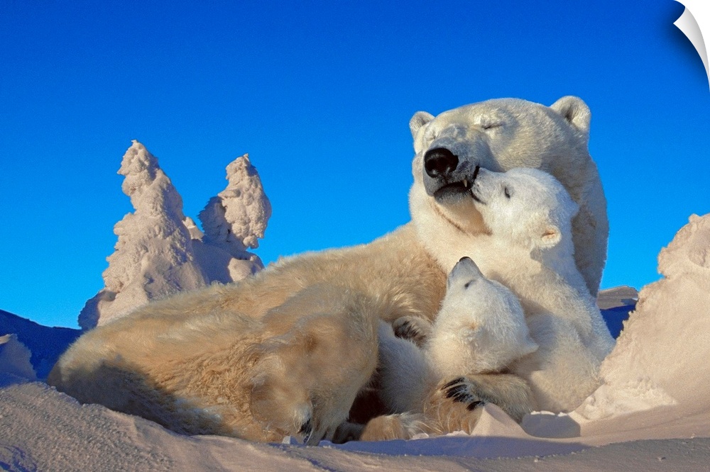 <p>An oversize piece that is a photograph of a polar bear with it's cubs while laying in the snow.</p>