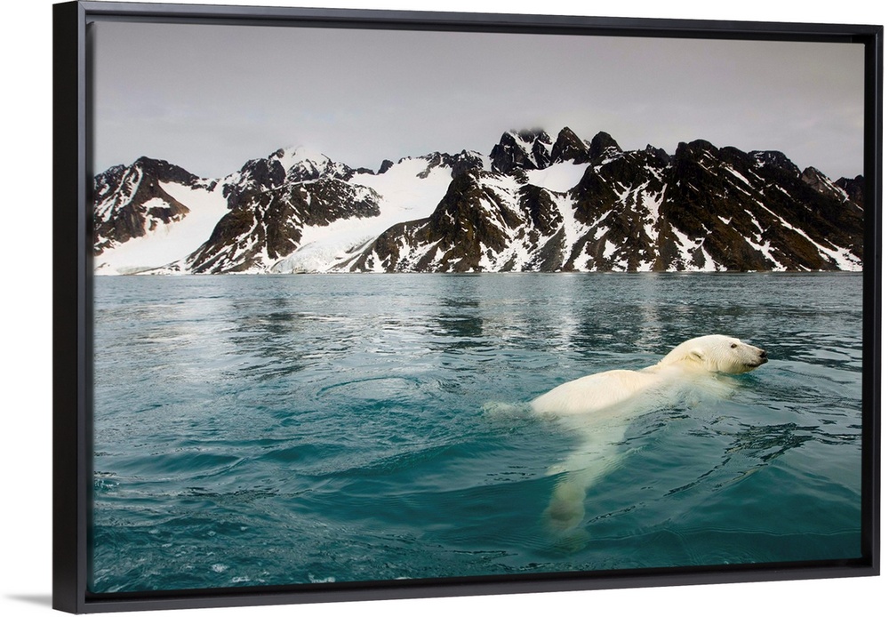 <p>Norway, Svalbard, Spitsbergen Island, Polar Bear (Ursus maritimus) swimming in Fuglefjorden (Bird Fjord) on summer evening. Photograph by Paul Souders.</p>