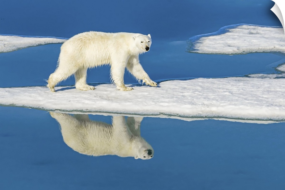 <p>Polar bear (Ursus maritimus) walking on melting pack ice reflected in blue water pools Svalbard, Norway</p>