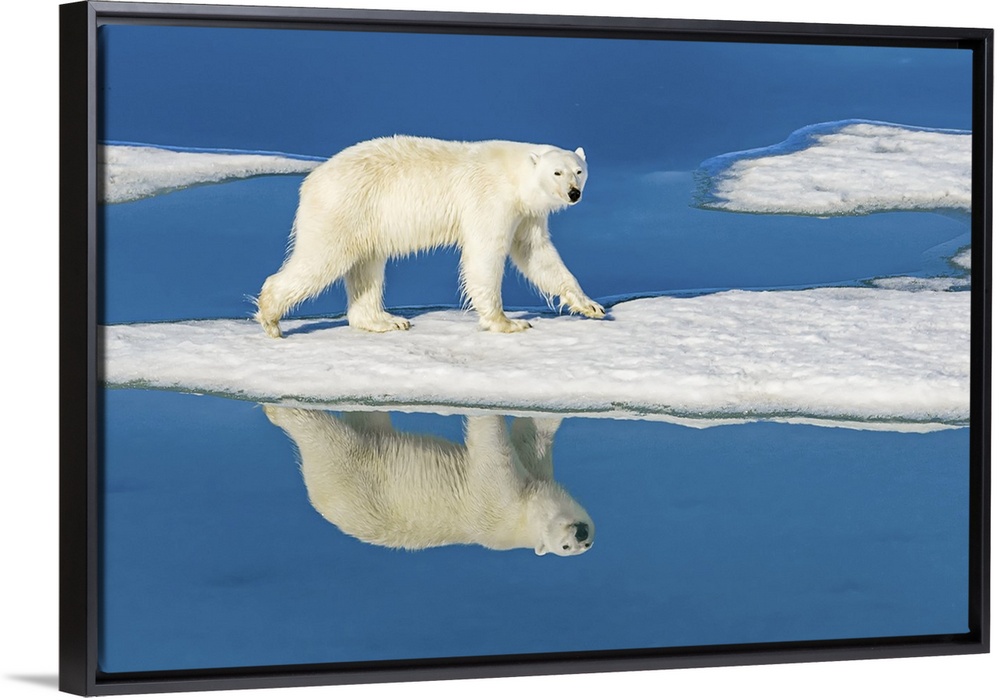 <p>Polar bear (Ursus maritimus) walking on melting pack ice reflected in blue water pools Svalbard, Norway</p>