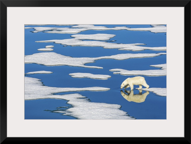 <p>Polar bear (Ursus maritimus) walking on melting pack ice with blue water pools, Svalbard, Norway</p>