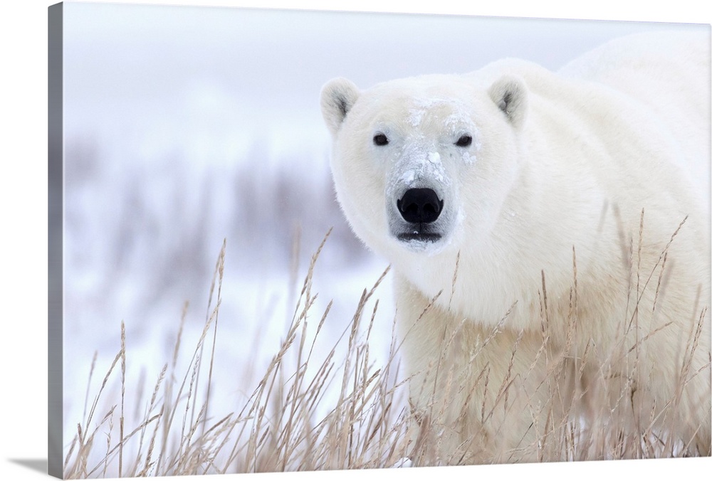 <p>Polar bear (ursus maritimus) walking through the snow and blizzard near Churchill. Manitoba, Canada.</p>