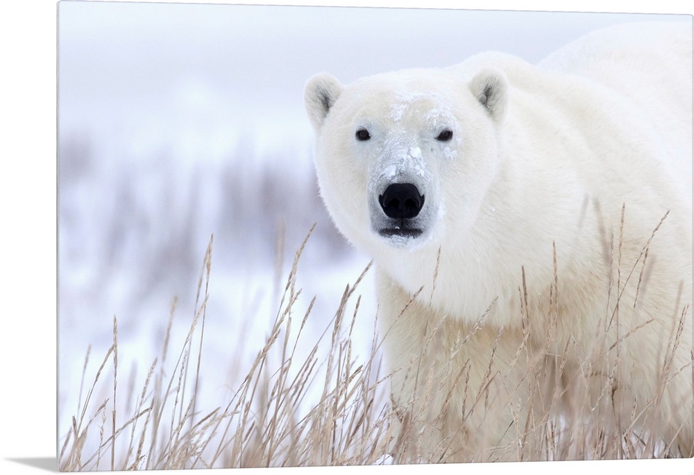 <p>Polar bear (ursus maritimus) walking through the snow and blizzard near Churchill. Manitoba, Canada.</p>