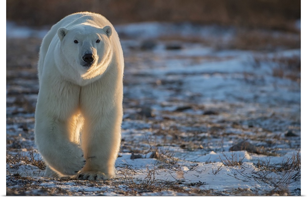 <p>Polar bear (Ursus maritimus) walking towards us in the setting sunlight; Churchill, Manitoba, Canada</p>