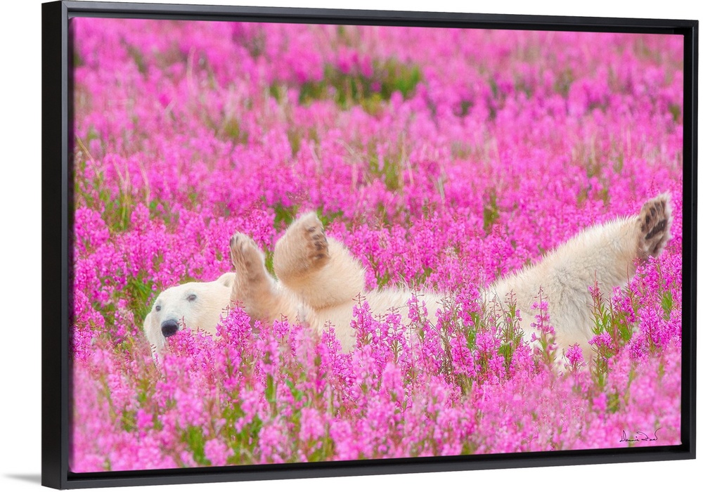 <p>Polar Bear relaxing in a field of pink fireweed. This image was named one of the top 50 in the world as published by My Modern Met Magazine in 2015.</p>