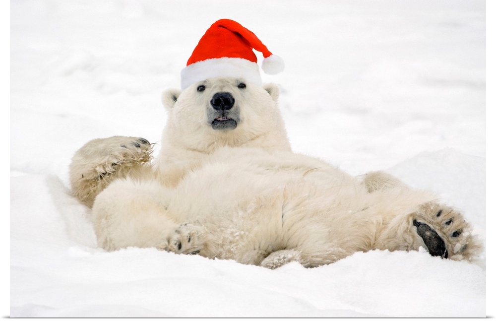 <p>Photograph taken of a large polar bear laying in the snow wearing a Santa hat.</p>