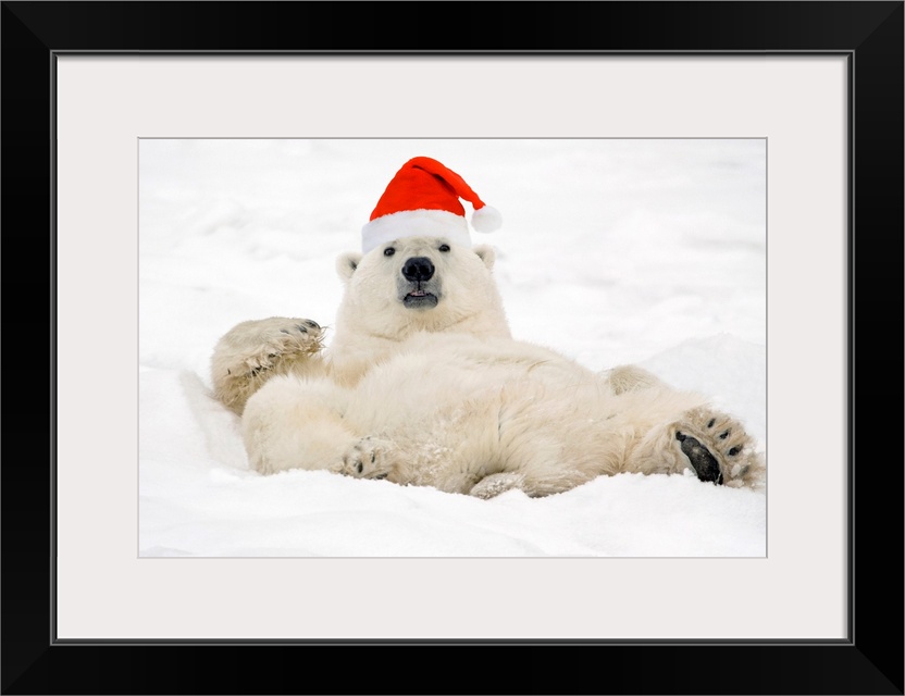 <p>Photograph taken of a large polar bear laying in the snow wearing a Santa hat.</p>