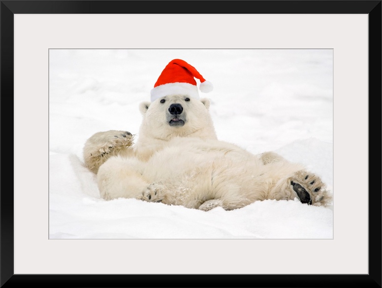 <p>Photograph taken of a large polar bear laying in the snow wearing a Santa hat.</p>