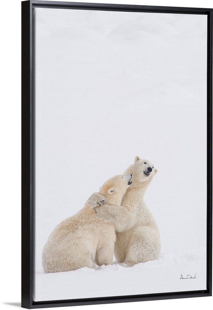 <p>Polar bears in a friendly wrestling embrace on sub-Arctic Hudson Bay ice and snow, Churchill, MB, Canada.</p>