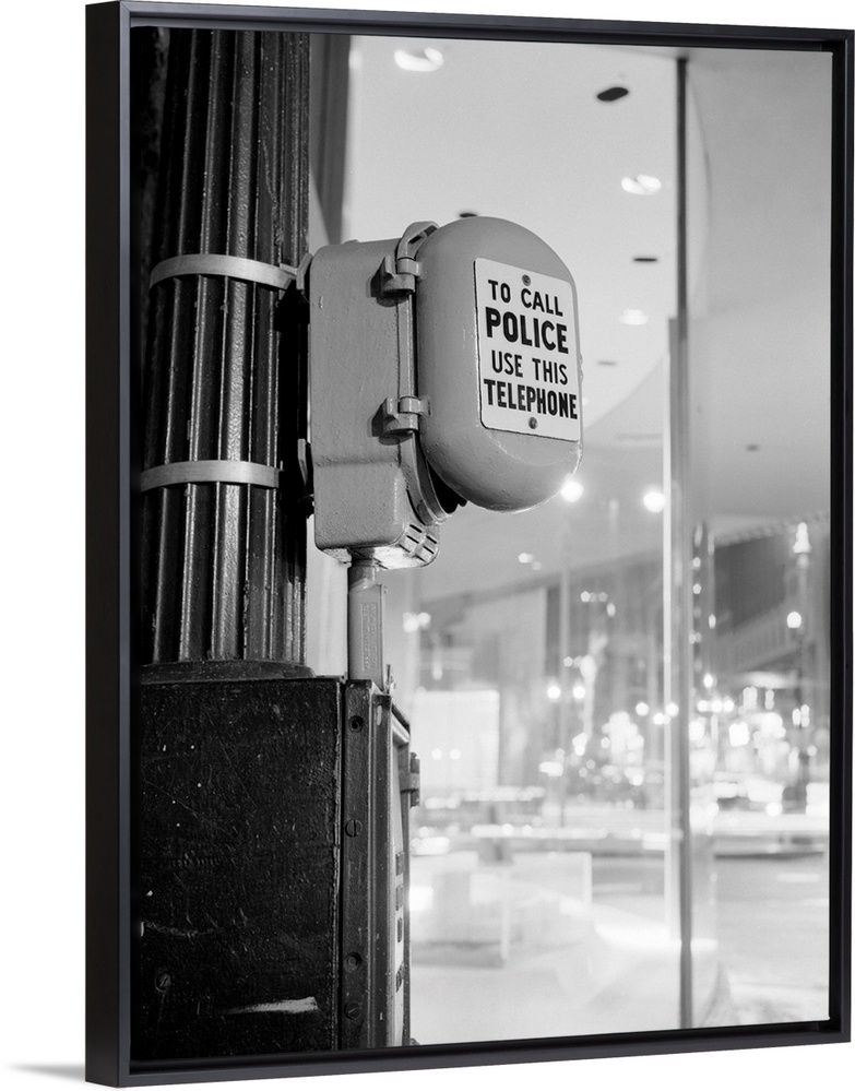 <p>Police Call box mounted on light pole in street.</p>