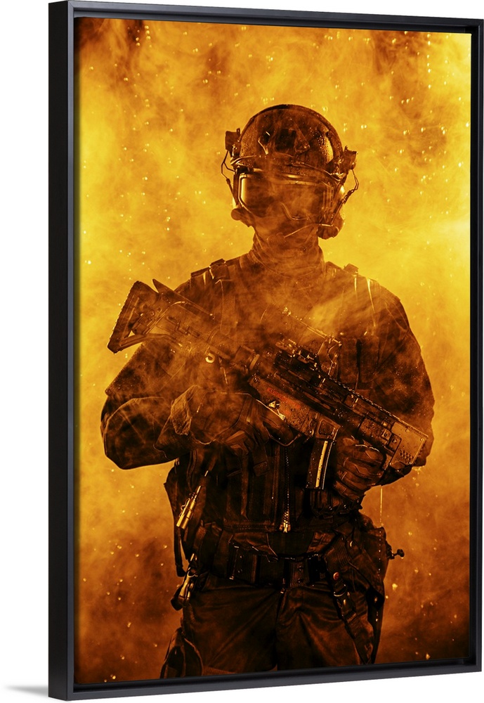 <p>Police officer SWAT in black uniform in the smoke.</p>