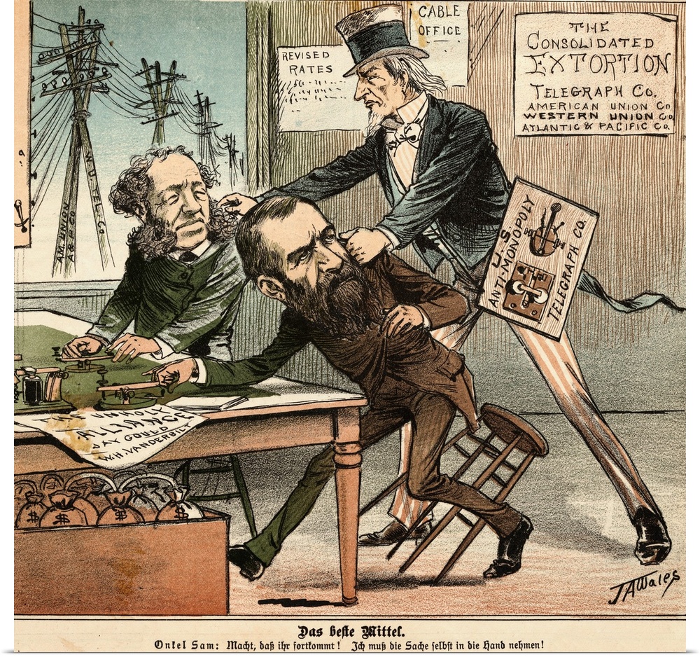<p>1881 political cartoon, with German caption, illustrating Uncle Sam's attempt to curb W. H. Vanderbilt and Jay Gould's monopoly of the telegraph companies.</p>
