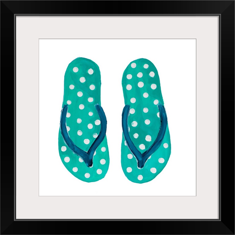 <p>Square painting of teal and blue flip flops with white polka dots.</p>