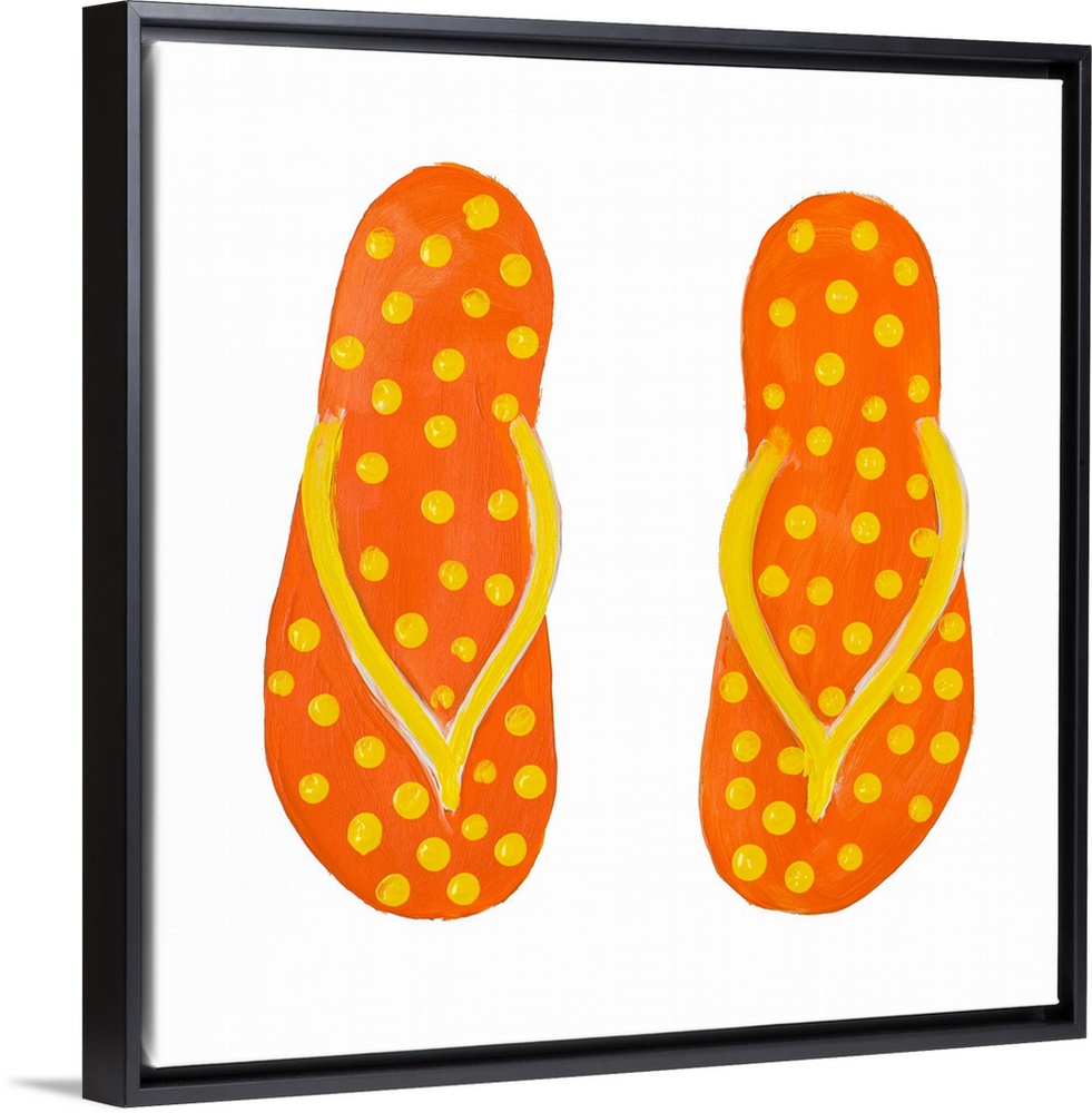 <p>Square painting of orange flip flops with yellow polka dots.</p>