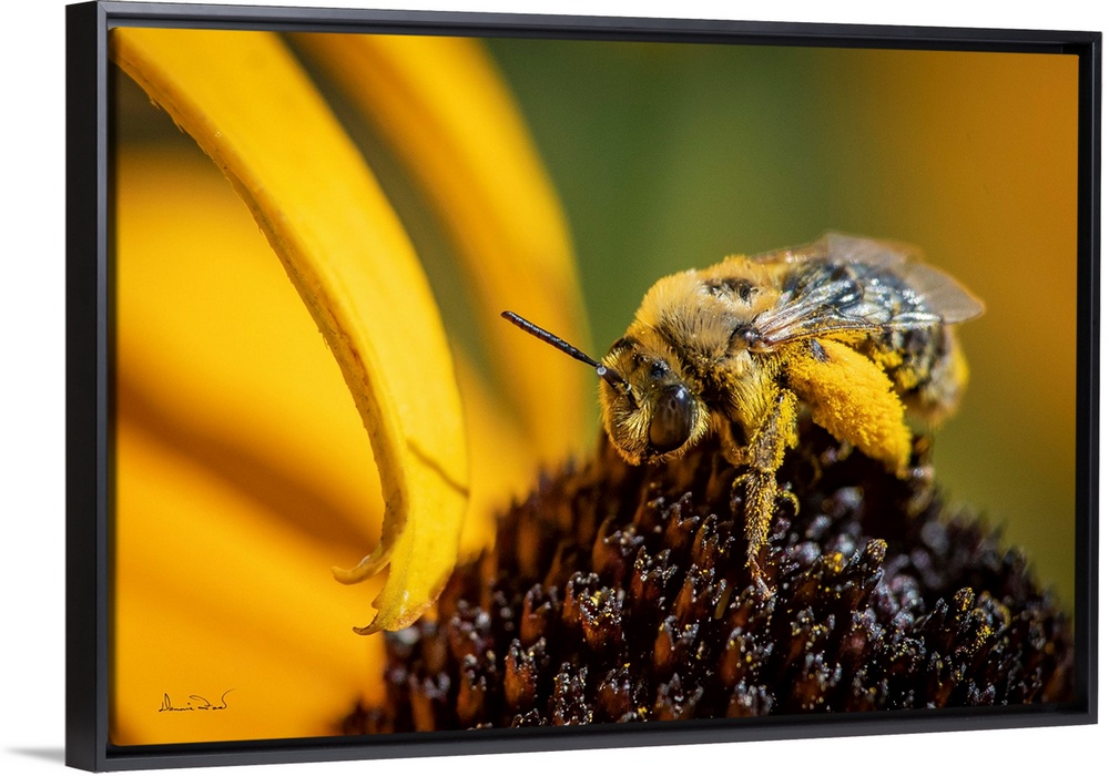 <p>Native Manitoba wild bee feeding on sneezeweed (Helenium autumnale), and becoming covered in pollen in the process.</p>