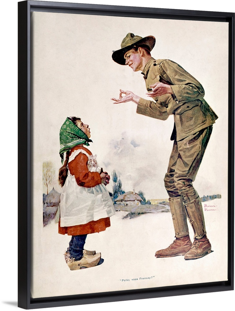 <p>Distant from the activities of the war raging in Europe, Norman Rockwell was challenged to record his interpretation of the effects of World War II on servicemen, and on Americans at home. Alternate Title Soldier Speaking to Little French Girl. Approved by the Norman Rockwell Family Agency</p>