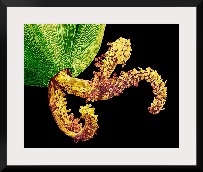 <p>Pollinated flower pistil. Coloured scanning electron micrograph (SEM) of pollen (round, orange) on the stigmas (yellow) of a field pennycress (Thlaspi arvense) flower pistil. The pistil is the female reproductive part of the flower. It can be divided into several carpels with a stigma at their tips. The stigma is where pollen lands during pollination. The pollen grains are male gametes (reproductive cells) that can fertilise a female gamete to produce a seed. This requires the male gamete to travel down the style (the structure that supports the stigma) to the ovary at the base of the pistil. Magnification: x33 at 6x7cm size.</p>