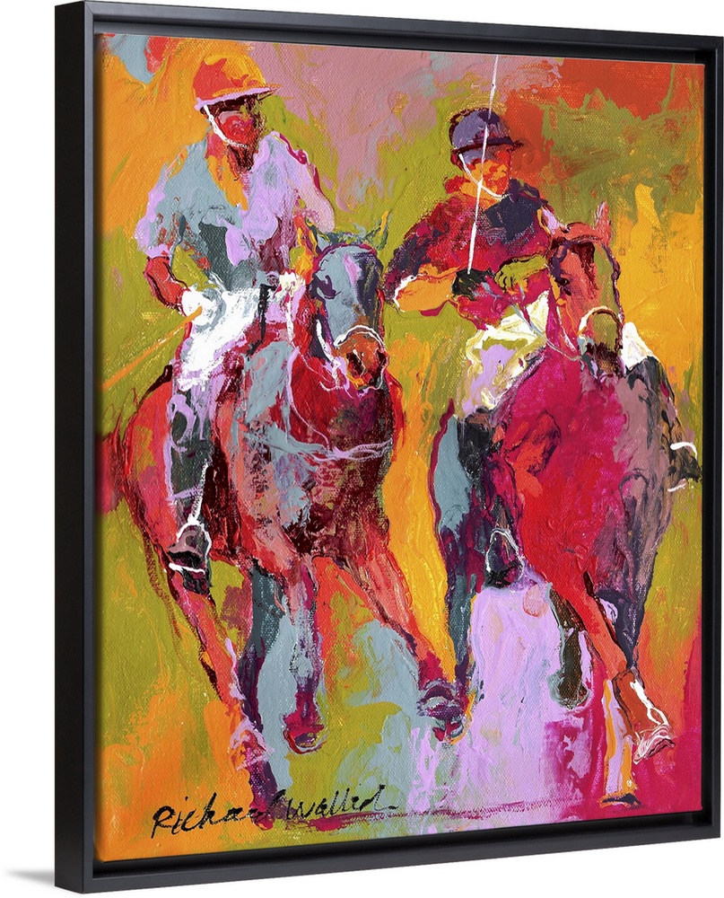 <p>Contemporary colorful painting of a polo match from atop horseback.</p>