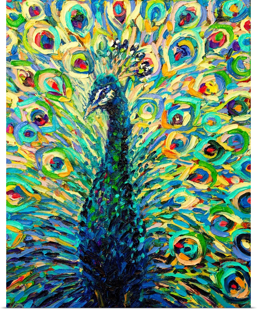 <p>Brightly colored contemporary artwork of a peacock with it's tail fanned out.</p>