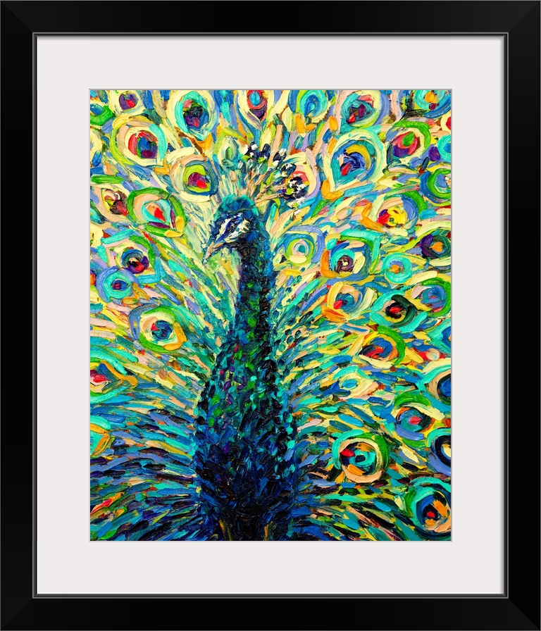 <p>Brightly colored contemporary artwork of a peacock with it's tail fanned out.</p>