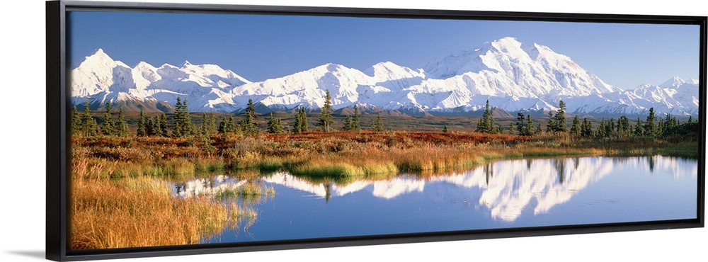 <p>Panoramic photograph shows a range of snow covered mountains filling the horizon and sitting behind a vast open space scattered with trees. The open landscape can be seen reflecting perfectly over the small body of water in the foreground.</p>