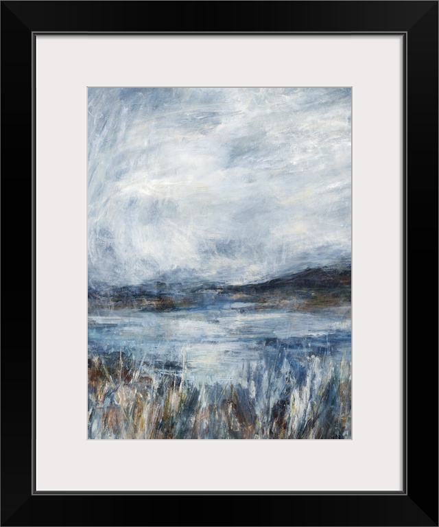 <p>Contemporary abstract painting of a cool toned pond landscape.</p>