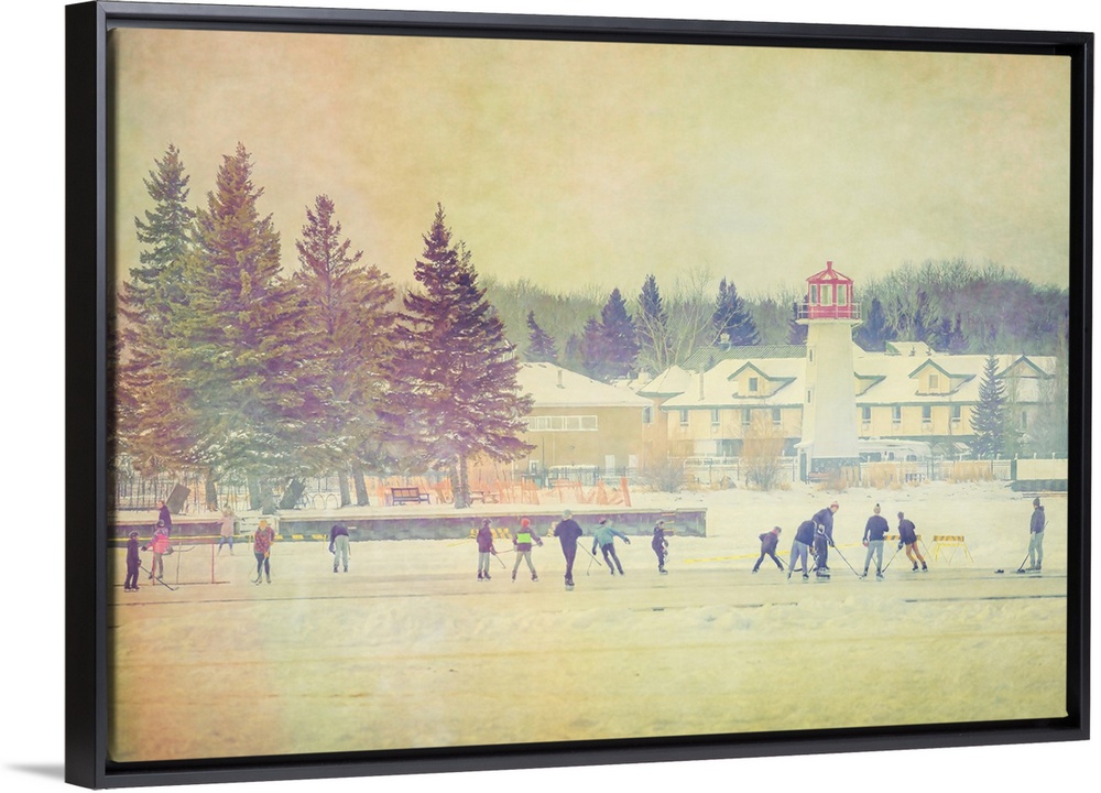 <p>Photo illustration of people playing hockey on a frozen lake in winter. Sylvan Lake, Alberta, Canada.</p>