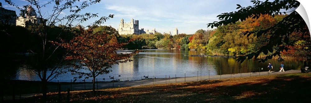<p>Panoramic photograph of lake in a park with trees and skyline in the distance under a cloudy sky.</p>