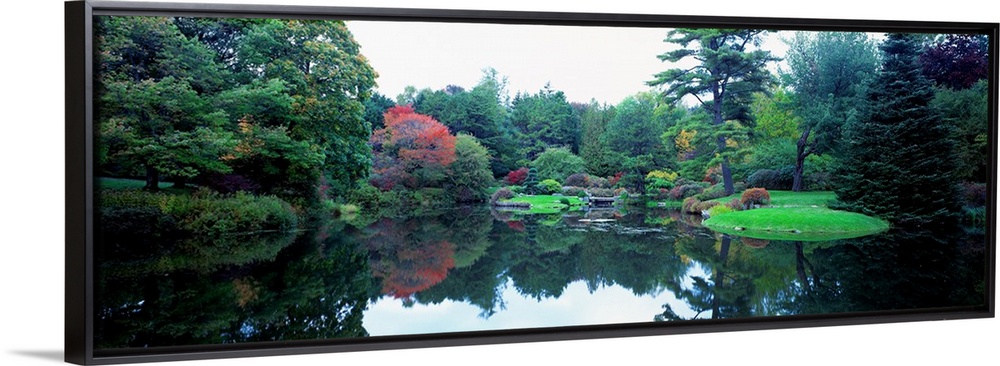 <p>Panoramic photograph of the vibrant Asticou Azalea Garden reflecting in the water of a large pond, in Northwest Harbor, Maine.</p>