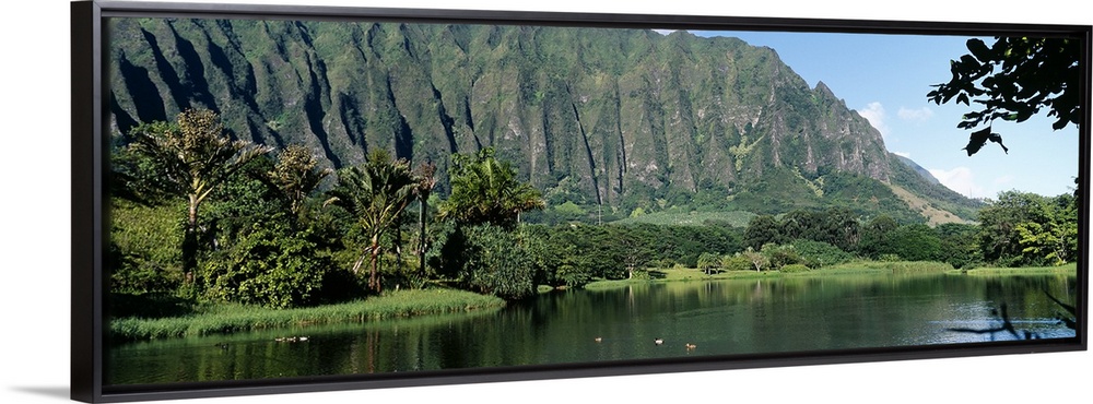 <p>Mountains overlooking ducks in a lagoon at the Hoomaluhia Botanical Garden in Kaneohe, Hawaii.</p>
