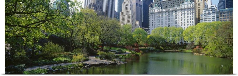 <p>A large pond in Central Park is photographed with thick foliage lining the left side and buildings pictured in the background.</p>
