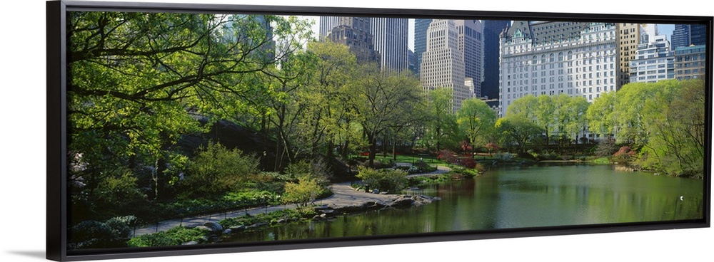<p>A large pond in Central Park is photographed with thick foliage lining the left side and buildings pictured in the background.</p>
