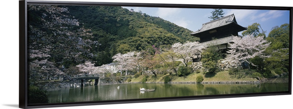 <p>This panoramic picture is taken of a house in Japan that is surrounded by cherry blossom trees and sits on a large pond.</p>