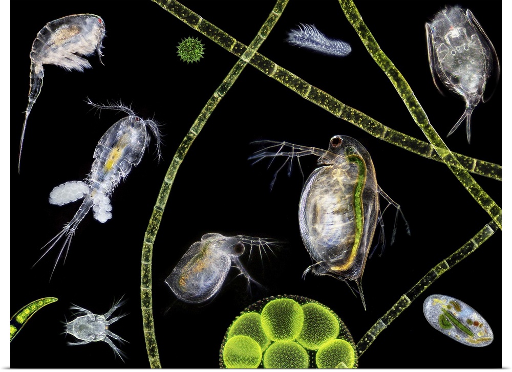 <p>Pond life, macrophotograph. At centre are two water fleas (Daphnia sp.). A copepod (Cyclops sp.) carrying eggs is at centre left. Part of a colony of Volvox sp. algae is at bottom centre. Strands of filamentous algae cross the image.</p>